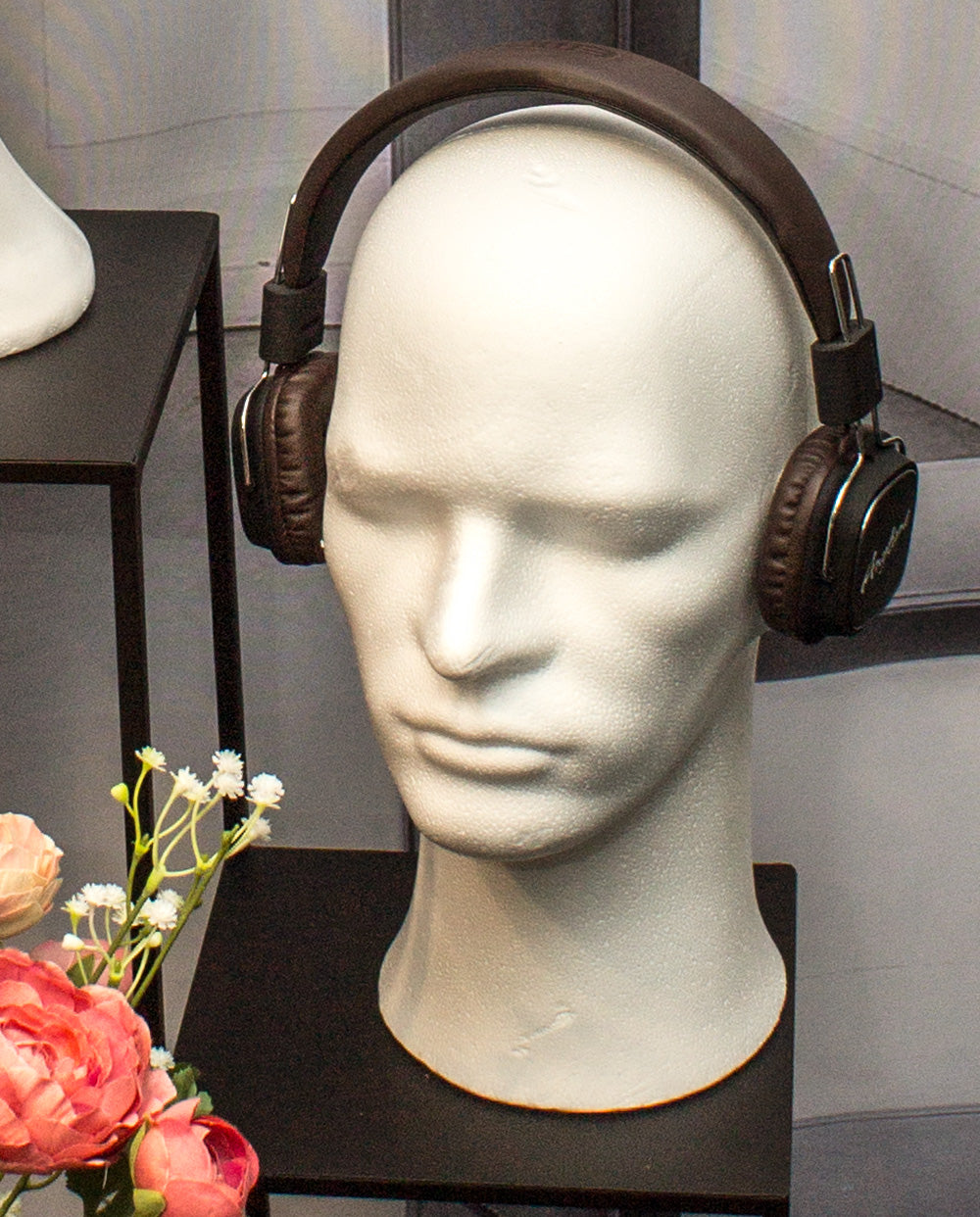 | Weißer Flamingokopf mit Männergesicht. B 59 x H 31 cm. Verkauft zur Präsentation von Schweißerabschirmungen, Golfcaps und vielem mehr. Möglichkeit mit Metallfuß - rufen Sie das SuperSellerS-Team an | Regulärer Preis