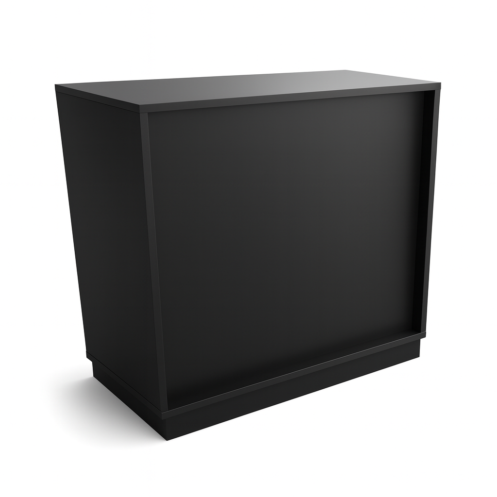 Frame-disk – breites Modul, schwarz. Stabile und attraktive Verkaufstheke aus schwarzem Melamin. Trennfächer und Ablage sorgen für Ordnung bei der Ausstattung, während die Rollen den Transport erleichtern. Geeignet sowohl einzeln als auch als Modul in größeren Thekenaufbauten. Die Front kann leicht an das Geschäft angepasst werden. In der Ablage ist eine Öffnung für Kabelführung, sodass Kasse, Beleuchtung, Computer oder Ladegeräte ohne Kabelsalat angeschlossen werden können. B110 x T55 x H91 cm (mit Rollen H93 cm)