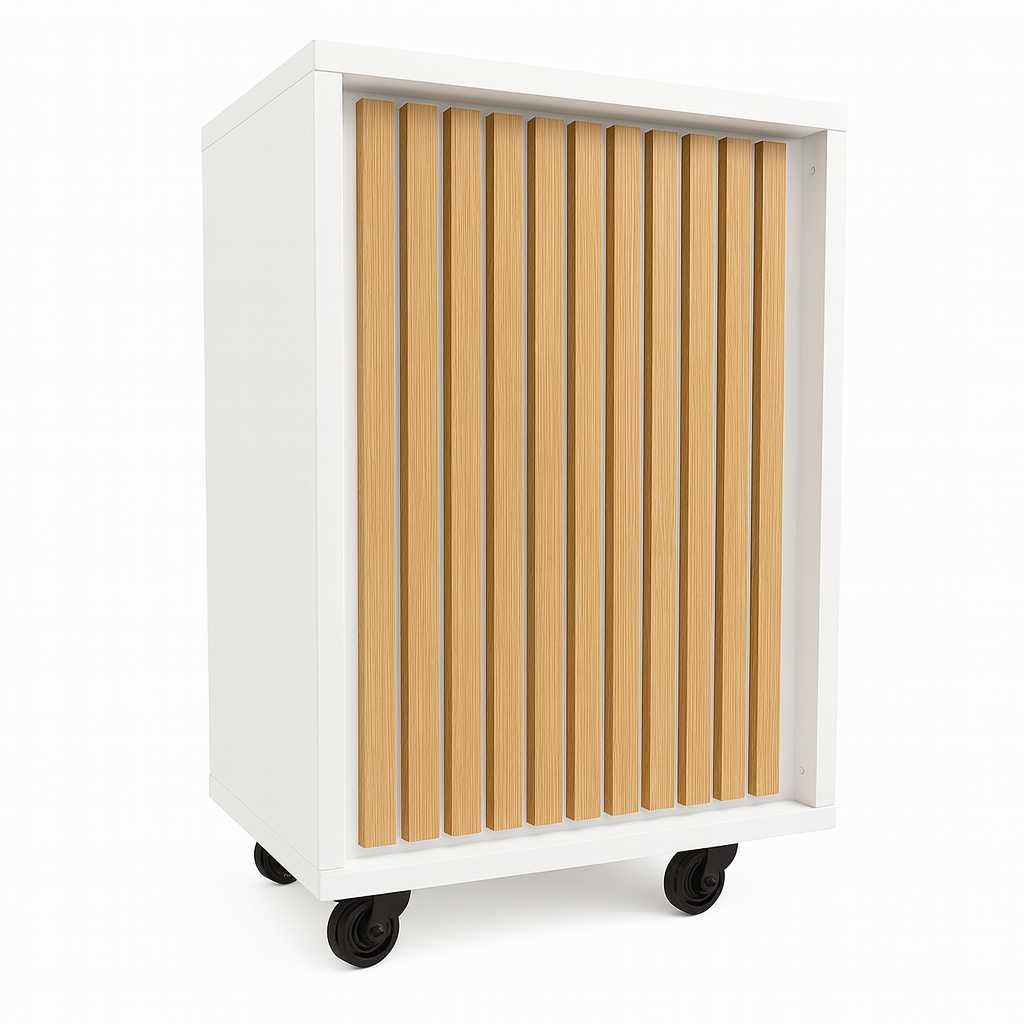 Frame-disk – schmales Modul, weiß. Eine praktische und helle Theke. Die Theke ist aus melaminbeschichtetem Material mit Struktur gefertigt. Die Front ist zurückgesetzt, sodass sie mit einem Logo, einer Holzfront gestaltet werden kann oder einfach so verwendet werden kann, wie sie ist. Die Theke verfügt über ein inneres Fach mit Platz für ggf. Kabel. Rollen sind im Lieferumfang enthalten. Die Theke kann allein stehen oder in einem Winkel/U-Form aufgebaut werden. B55 x T55 x H91 cm (mit Rollen H93 cm)