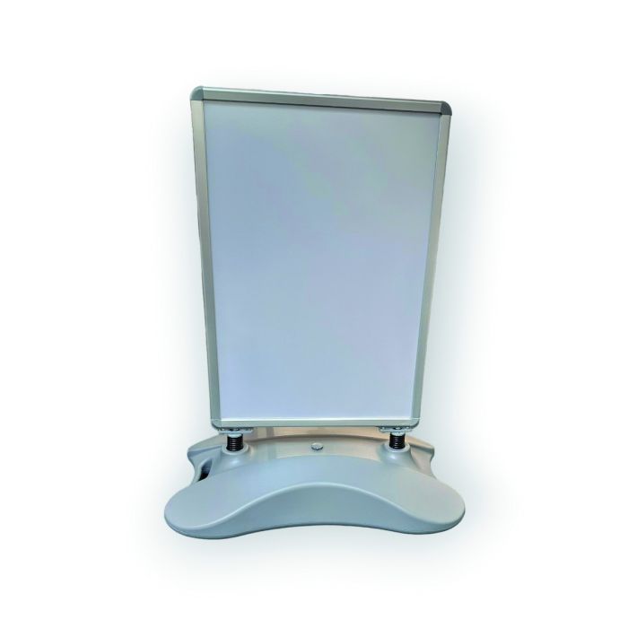 Stormmaster Gehwegaufsteller für Poster in der Größe 70 x 100 cm. Besonderheit dieses Gehwegaufstellers ist, dass das Schild auf Federn montiert ist; diese Federn sorgen für die erforderliche Flexibilität, insbesondere bei Wind. Der Fuß besteht aus schlagfestem Kunststoff und kann entweder mit Wasser oder Sand gefüllt werden. Um Frostschäden zu vermeiden, kann er auch mit Frostschutzmittel befüllt werden, wodurch das Gefrieren des Wassers verhindert wird. Außerdem sind zwei Räder am Aufsteller montiert, wodurch das Kippen und ein einfaches Verschieben je nach Bedarf möglich ist. Zwei reflexfreie PET-Platten sind im Lieferumfang enthalten. Maße: H133 x 98 x 61 cm. Plakatmaß 70 x 100 cm. Aluminiumfarbig / grau. Neue PET-Platten sind unter der Artikelnr.: 7028-00 erhältlich.