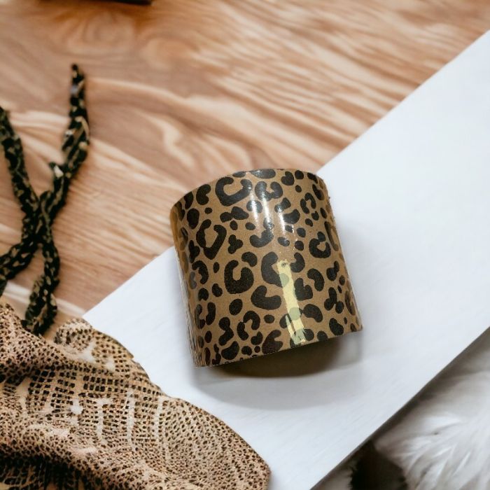 Geschenkpapier mit Jaguar-Print auf braunem Kraftpapier-Hintergrund. Geeignet zum Verpacken kleiner Geschenke, Schmuckschachteln oder länglicher Gegenstände. Kann auch zur Dekoration verwendet werden. Maße: Breite 10 cm x Länge 100 m.