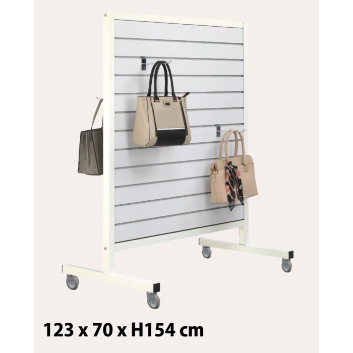 Eine praktische und stilvolle Verkaufs-Gondel im weißen Design – mit Lamellenwand auf beiden Seiten und stabilem Stahlgestell. Die Lamellenwände erleichtern die Präsentation von Waren an Haken, Regalen oder Trägern und eignen sich ideal für Mittelplatzierungen im Geschäft, bei denen die Waren von beiden Seiten sichtbar sein sollen. Ideal zur Präsentation von Kleidung, Accessoires, Schuhen, Geschenkartikeln, Eisenwaren oder Aktionsware. Die Gondel lässt sich bei Bedarf leicht verschieben und passt in Einzelhandelsgeschäfte, Showrooms und Pop-up-Umgebungen.