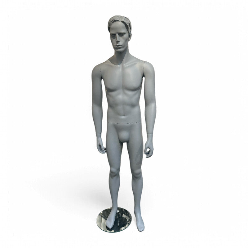Männliche Schaufensterpuppe mit Gesichtszügen und modelliertem Haar – für eine besonders realistische Präsentation. Die Puppe wird mit einer Fußplatte geliefert. Waden- und Fußspitzen ermöglichen die Präsentation von Schuhen. Die Puppe ist aus Fiberglas gefertigt und verfügt über eine runde Glasfußplatte. Maße: Höhe 186 cm, Brustumfang 97,5 cm, Taillenumfang 77 cm, Hüftumfang 94 cm, Fußlänge 27 cm. Farbe: Mattgraues Fiberglas. Runde Glasfußplatte.