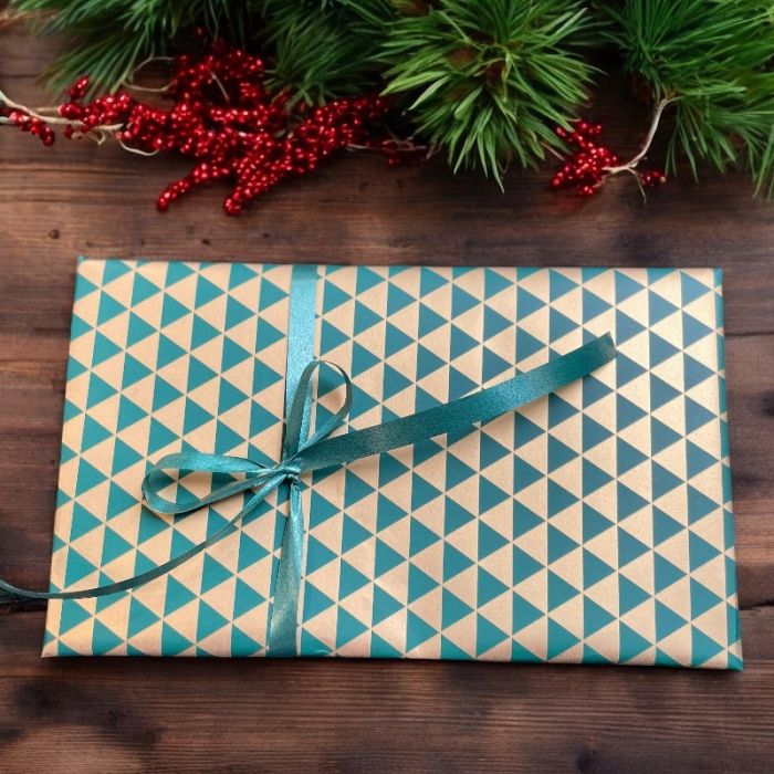 Geschenkpapier in Gold mit grünen Dreiecken. Modern, aber dennoch traditionell. Die grünen Dreiecke erinnern an Weihnachtsbäume und schaffen eine gemütliche, warme Atmosphäre rund um die Geschenke. Maße: Breite 50 cm x 100 m. 80 g/m². Weiß beschichtet. Die beiden Kontrastfarben Gold und Grün bieten Kombinationsmöglichkeiten mit allen Bändertypen in diesen Farben. Besonders wirkungsvoll ist ein Metallband oder Glitzer in Gold. Ein Band aus rotem Bast wäre ebenfalls ansprechend.