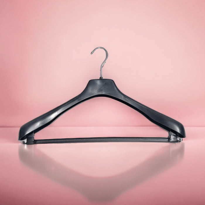 Kleiderbügel mit einer Schulterbreite von 4 cm und mit Stange, für Erwachsene. Schwarzer Kunststoff. Maße: 45 cm. Verpackt zu 55 Stk. Preis angegeben pro Stück.