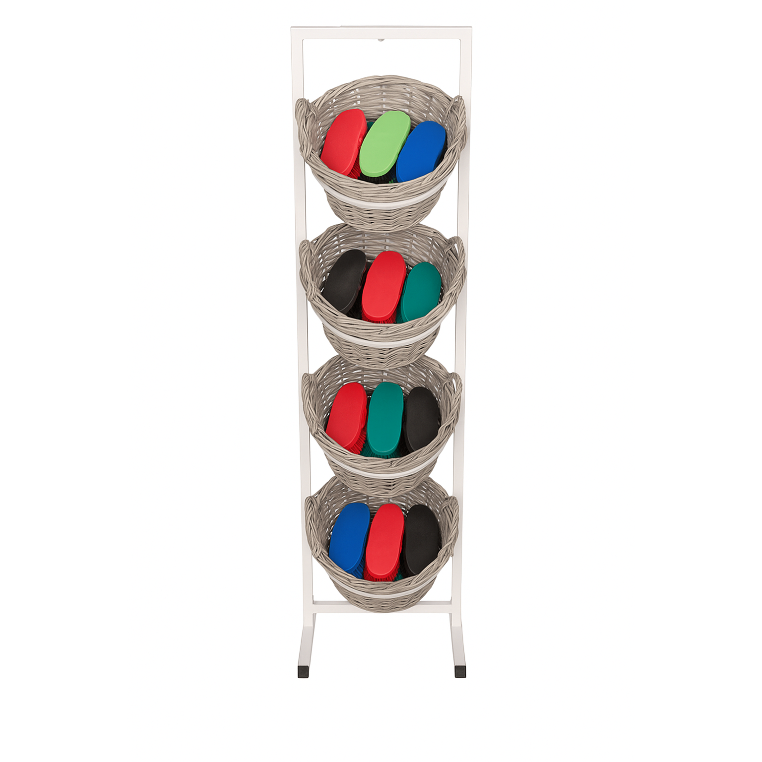 Korbständer mit 4 Körben für Ihre Waren. Möglichkeit für ein A4- oder A3-Metallschild oben. Der Korbständer wird mit Bodenschonern geliefert. Ein Radsatz kann dazugekauft werden, damit der Ständer bewegt und die Reinigung erleichtert werden kann. Maße: B 45 x H 173 cm. Fuß: B 45 x T 40,5 cm. Der Korb hat eine used-Optik im Stil unserer Heritage-Inventarserie. Der Korb wird mit einer Kunststoff-Einlage geliefert. Die Einlage ist mit einem kleinen Draht befestigt, der sich leicht entfernen lässt.