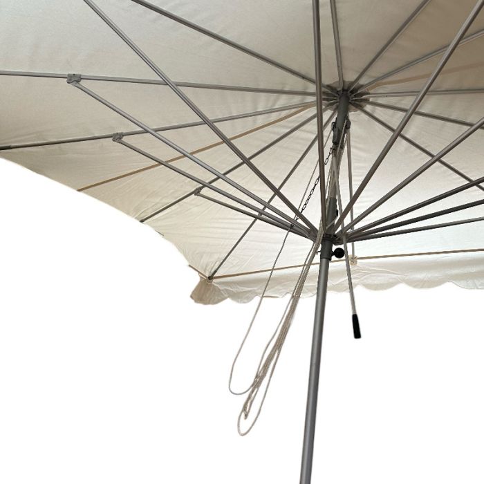 Teleskopisch, ohne Fuß. Höhe 2,7 Meter. Tischdecke 3 x 4 Meter. Stangendurchmesser 3,5 cm. Tischdecke naturweiß.