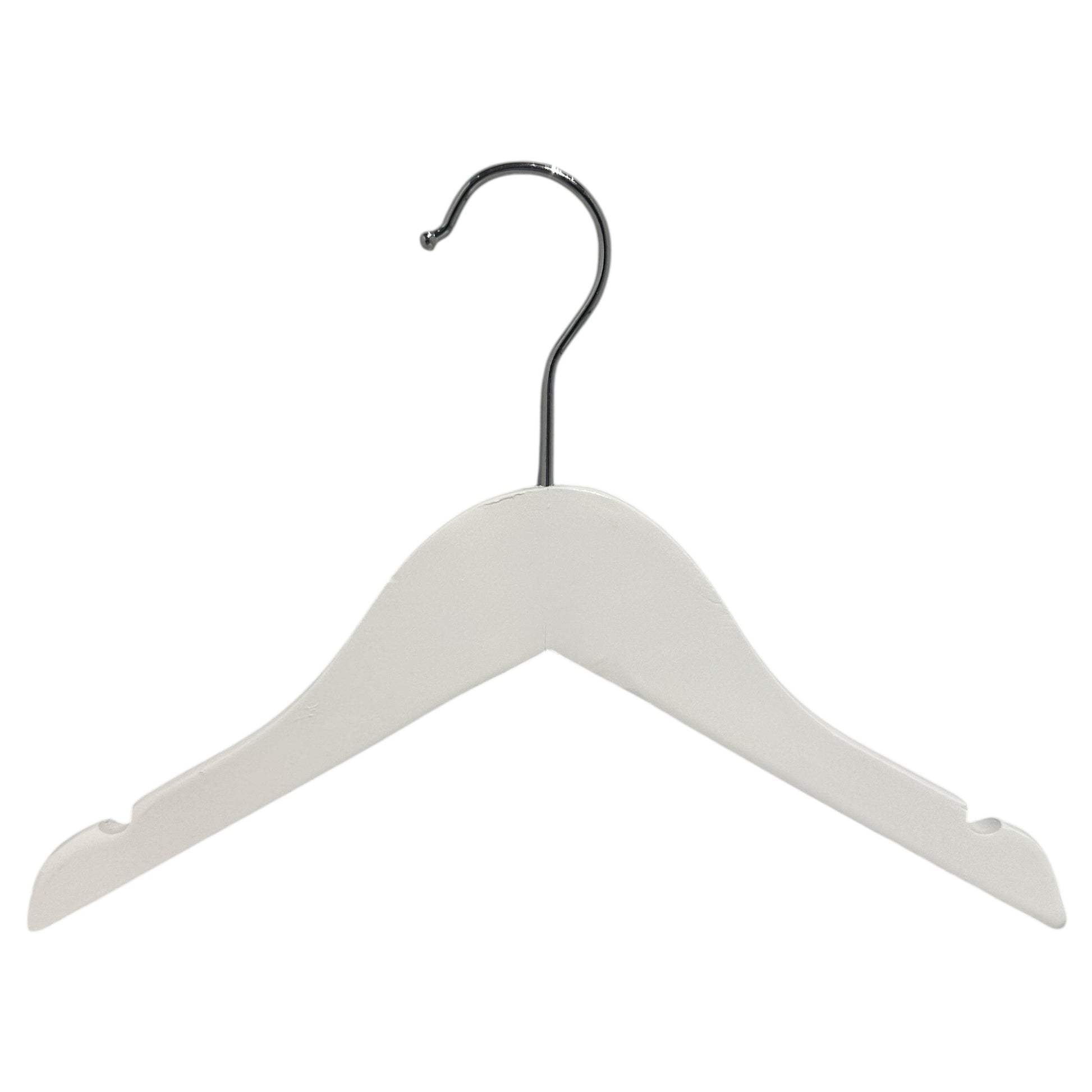 Baby-Kleiderbügel mit Aussparung, aus Holz gefertigt und mit 3 mm glänzender Haken. Der Bügel ist perfekt für Kinder- und Babykleidung und hat eine Einkerbung zum Befestigen von Röcken. Maße der Bügel: B 27 cm. Farben: Weiß (4012-01) Natur (4012-59) Schwarz (4012-04). Verpackt zu 50 Stück. Preis pro Stück angegeben.