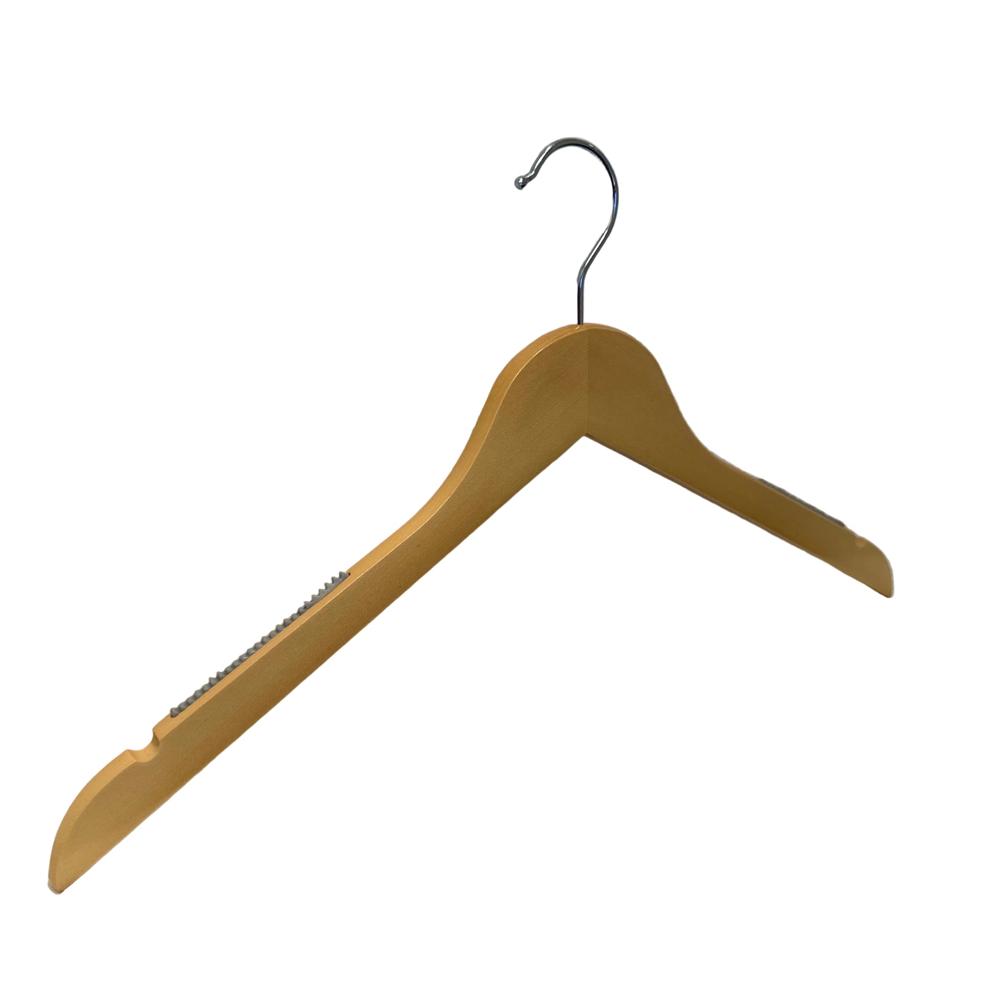 Holzbügel, massiv, flach, Erwachsene, mit Gummi und Kerbe, ohne Stange, helles Natur, 12 mm dick, 45 cm.